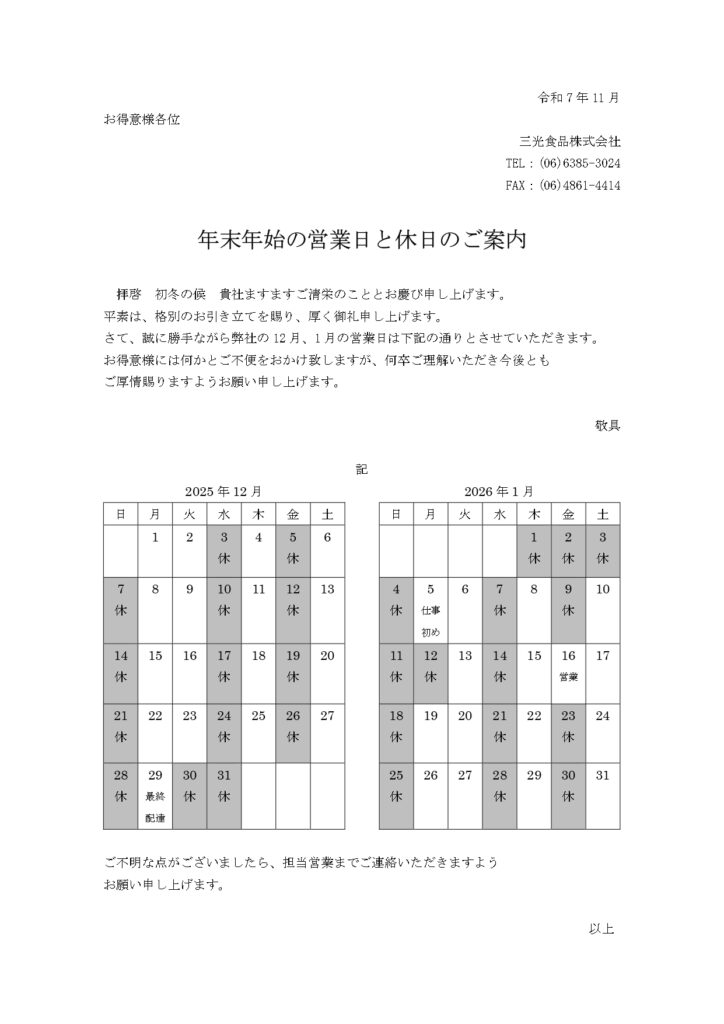 CONTACT ホーム 当社について 事業内容 取扱製品 会社概要 採用情報 先輩社員の声 お知らせ ホーム 当社について 事業内容 取扱製品 ふるさと納税返礼品 会社概要 採用情報 先輩社員の声 お知らせ 06-6385-3024 お問い合わせ お知らせnews ホーム お知らせ 年末年始の営業日と休日のご案内 2025.11.17 年末年始の営業日と休日のご案内 平素は、格別のお引き立てを賜り、厚く御礼申し上げます。さて、誠に勝手ながら弊社の12月および、1月の営業日は下記の通りとさせていただきます。何かとご不便をおかけ致しますが、何卒ご理解いただきご厚情賜りますようお願い申し上げます。 一覧へ