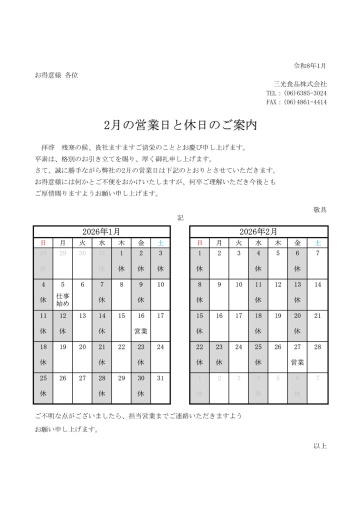 CONTACT ホーム 当社について 事業内容 取扱製品 会社概要 採用情報 先輩社員の声 お知らせ ホーム 当社について 事業内容 取扱製品 ふるさと納税返礼品 会社概要 採用情報 先輩社員の声 お知らせ 06-6385-3024 お問い合わせ お知らせnews ホーム お知らせ 2月の営業日と休日のご案内 2026.01.19 2月の営業日と休日のご案内 平素は、格別のお引き立てを賜り、厚く御礼申し上げます。さて、誠に勝手ながら弊社の2月の営業日は下記の通りとさせていただきます。何かとご不便をおかけ致しますが、何卒ご理解いただきご厚情賜りますようお願い申し上げます。 一覧へ